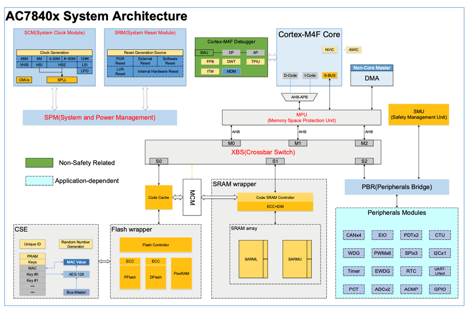 AC7840x是基于ARM Cortex-M4F內(nèi)核的車規(guī)級MCU,于2022年上市。產(chǎn)品符合AEC-Q100 Grade1, 功能安全符合ISO 26262 ASIL-B,信息安全符合SHE標(biāo)準(zhǔn),支持安全啟動(dòng)。軟件生態(tài)支持AUTOSAR MCAL4.4,可提供MCAL及配置工具。產(chǎn)品擁有雙Bank Flash用于存儲程序,支持OTA。AC7840x可廣泛應(yīng)用于汽車車身、座艙、車燈、新能源以及電機(jī)控制等應(yīng)用領(lǐng)域。
