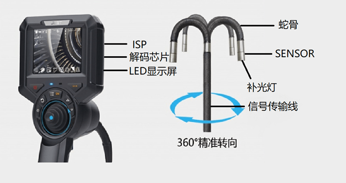 工業(yè)內(nèi)窺鏡主要由補(bǔ)光燈、SENSOR、蛇骨、信號(hào)傳輸線、ISP(圖像信號(hào)處理器)、解碼芯片、LED顯示屏組成,由于從SENSOR傳輸出來的圖像是原始圖像所以需要使用ISP在經(jīng)過BLC、AE、AWB、2D\3D降噪等圖像處理后使圖像達(dá)到客戶想要的視覺效果,并通過編解碼芯片對(duì)視頻進(jìn)行編解碼處理以保證內(nèi)窺鏡長距離、高質(zhì)量的視頻傳輸效果。
