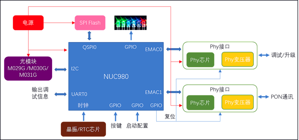 由于OLT設(shè)備需長(zhǎng)時(shí)間不斷電穩(wěn)定工作,新唐NUC980以其雙網(wǎng)口、300MHz主頻、內(nèi)置DDR和支持Linux系統(tǒng)等優(yōu)勢(shì)非常適合于工控行業(yè)應(yīng)用,NUC980負(fù)責(zé)對(duì)PON芯片進(jìn)行配置管理等。