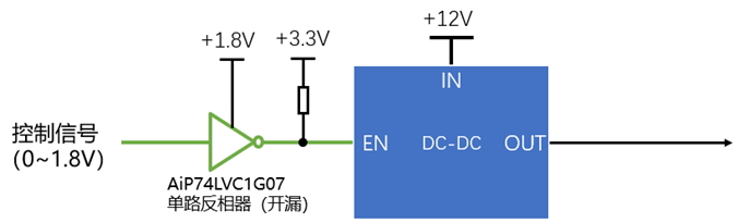 以下是一種使用開漏輸出的單路反相器對DC-DC控制信號進行電平轉(zhuǎn)換的應用,前級控制信號高電平為1.8V,而DC-DC要求使用>2V的高電平進行控制,因此需要進行電平轉(zhuǎn)換,以滿足DC-DC的使用要求。