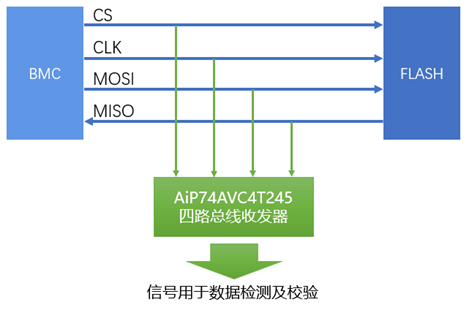 下圖是BMC與FLASH通過SPI進行通訊的一種應用,該應用中需要對SPI信號進行數(shù)據(jù)的檢測及校驗,因此需要將SPI信號外接到其他器件進行處理。若直接將信號引出到后端,相當于在SPI總線上額外增加了負載,對于高速SPI信號來說,會影響其信號完整性,嚴重時會導致數(shù)據(jù)讀寫錯誤。