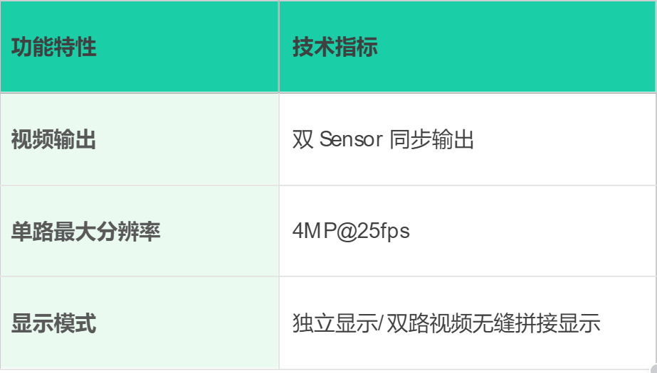 支持兩路不同Sensor同步輸出,雙路畫面獨(dú)立顯示或拼接顯示,同時(shí)可拼接兩路視頻輸出,實(shí)現(xiàn)更大視場角畫面。為當(dāng)前市場主流兩路Sensor輸出產(chǎn)品提供SoC解決方案。