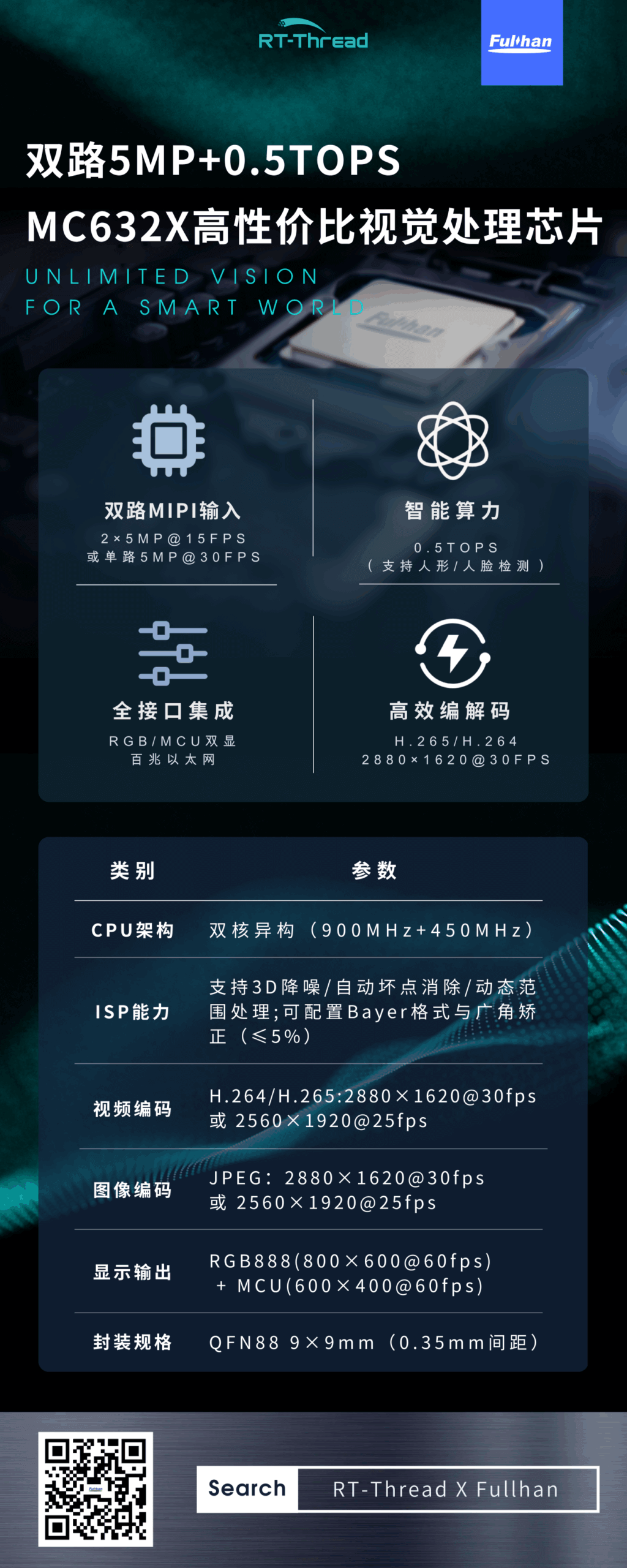 在智能視覺技術(shù)高速發(fā)展的浪潮中,行業(yè)對芯片性能、能效比和開發(fā)效率的需求正呈現(xiàn)爆發(fā)式增長。面對多路高清視頻處理、實(shí)時(shí)智能分析和快速產(chǎn)品化落地的三重挑戰(zhàn),RT-Thread操作系統(tǒng)攜手MC632X智能視覺處理器,帶來了突破性的解決方案。MC632X憑借高效快速、雙路顯示、全場景適配三大核心優(yōu)勢重新定義邊緣視覺處理。
