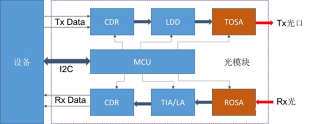 隨著光通信的高速發(fā)展,以同軸電纜、網(wǎng)線為代表的金屬介質(zhì)通信,逐漸被光纖介質(zhì)所取代;而光模塊,是光纖通信系統(tǒng)的核心器件之一。光模塊是實(shí)現(xiàn)光電轉(zhuǎn)換和電光轉(zhuǎn)換的關(guān)鍵器件,主要由光發(fā)射器(TOSA)、光接收器(ROSA)、功能電路和光電接口等部分組成。激光器產(chǎn)生高純度、高功率的激光光束,光接收器將激光光束轉(zhuǎn)換成電信號,調(diào)制器用于調(diào)制電信號以便在光纖中傳輸。