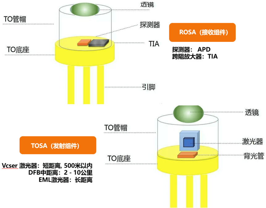 - ROSA:實(shí)現(xiàn)光/電轉(zhuǎn)換,主要包括PD/APD、DeMux、耦合組件等,封裝類型一般和TOSA相同。PD用于短距、中距的光模塊,APD主要應(yīng)用于長距光模塊。