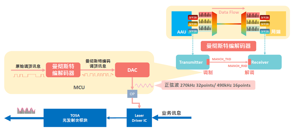 在SDH/WDM網(wǎng)絡(luò)中,每個(gè)波道通常會傳輸兩類信息,一類是業(yè)務(wù)信息,另一類是監(jiān)控和管理相關(guān)信息。監(jiān)控與管理信息,一般依附于業(yè)務(wù)信息傳遞,或使用獨(dú)立的通道資源。如果不使用獨(dú)立的通道,那么就需要調(diào)頂技術(shù)。調(diào)頂信號是在業(yè)務(wù)信號上迭加一個(gè)小幅度的信號,因此又稱為低頻微擾信號。此信號需以曼徹斯特碼做傳遞,即可利用信號的變化來保持發(fā)送和接收之間的同步。為產(chǎn)生及接收曼徹斯特碼,光模塊需具備曼徹斯特編解碼器,此處為調(diào)頂光模塊和通用光模塊最大的差異。