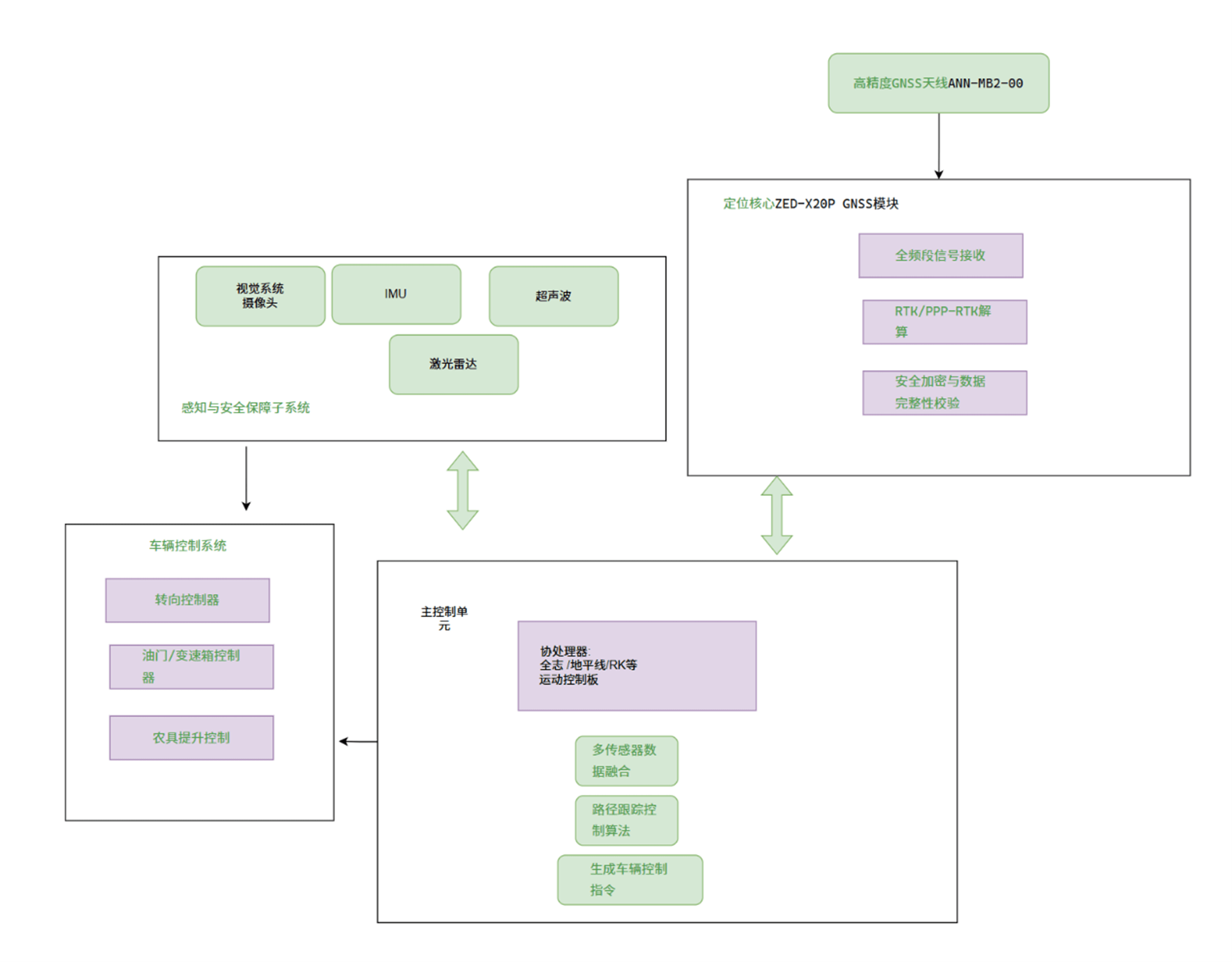 采用域控制器作為大腦。ZED-X20P作為高精度定位單元,通過串口(如UART)或CAN總線將位置、航向、時(shí)間等信息發(fā)送給域控制器。域控制器則同時(shí)接收來自IMU(獲取姿態(tài)角速度)、攝像頭、激光雷達(dá)等傳感器的數(shù)據(jù),運(yùn)行融合算法,最終計(jì)算出控制指令,通過CAN總線發(fā)送給拖拉機(jī)的轉(zhuǎn)向、油門和農(nóng)具控制系統(tǒng)。