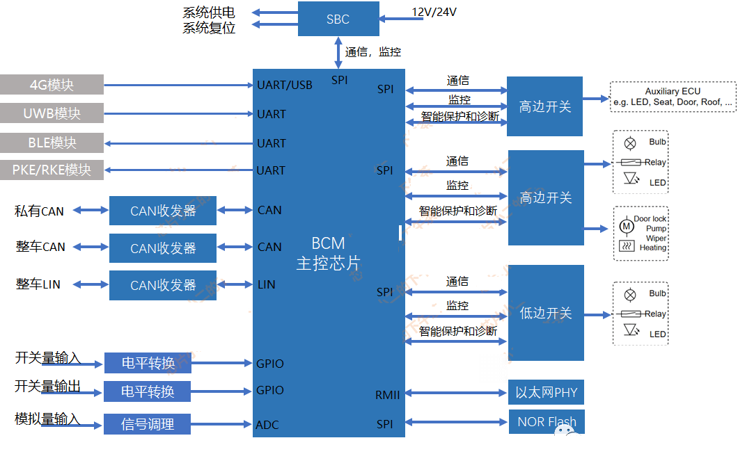 • ?功能集成?:整合傳統(tǒng)分散的ECU(如燈光控制、雨刮控制、門鎖系統(tǒng)等),統(tǒng)一管理信號(hào)輸入與輸出,減少系統(tǒng)復(fù)雜度。??2??3