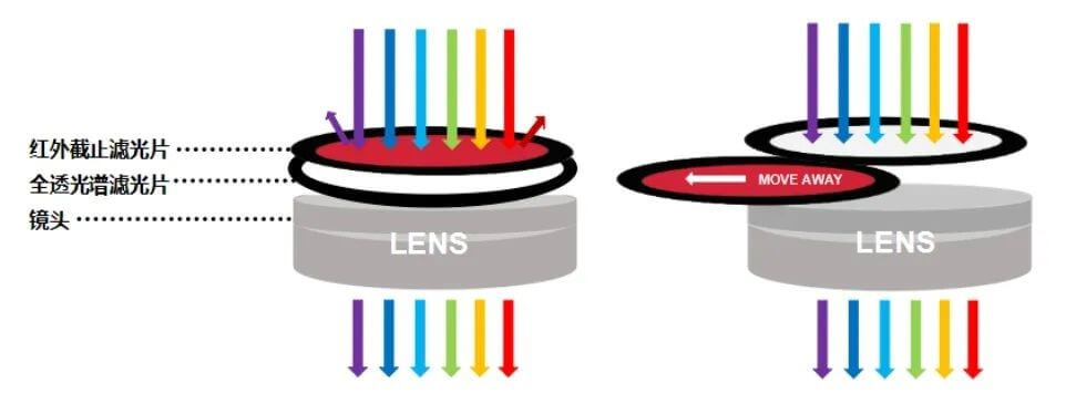 IR-CUT又稱雙濾光片切換器,在攝像頭鏡頭和感光芯片之間起到濾光的作用,能夠大大改善IPC的圖像質(zhì)量。其內(nèi)部由雙濾光片(一片紅外截止濾光片和一片全透濾光片) + 電機驅(qū)動構(gòu)成。當攝像頭環(huán)境光線充足,切換到紅外截止濾光片,此時圖像顏色非常好,當環(huán)境光線很暗,紅外燈開啟,切換到全透濾光片,此時圖像為黑白清晰圖像。
