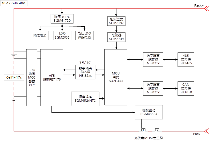 母線電壓取決于儲(chǔ)能電池系統(tǒng),48V系統(tǒng)為例,一級(jí)降壓BUCK及休眠LDO耐壓60V,如SGM61720/SGM61630;隔離電源有專(zhuān)用隔離電源芯片,或變壓器隔離分立方案等。