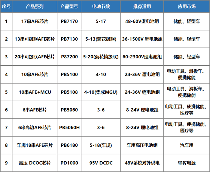 鵬申P(guān)B7170(17串電池AFE)是工業(yè)48V/60V鋰電池組標(biāo)準(zhǔn)解決方案芯片, 廣泛應(yīng)用于電動(dòng)自行車(chē)、機(jī)器人、UPS等領(lǐng)域。此外PB7130/PB7200分別單顆支持4-13/20串電池級(jí)聯(lián)應(yīng)用,且可擴(kuò)展菊花鏈,可實(shí)現(xiàn)24V-400V三元或磷酸鐵理電池組管理,為儲(chǔ)能市場(chǎng)提供極佳的多樣選擇。