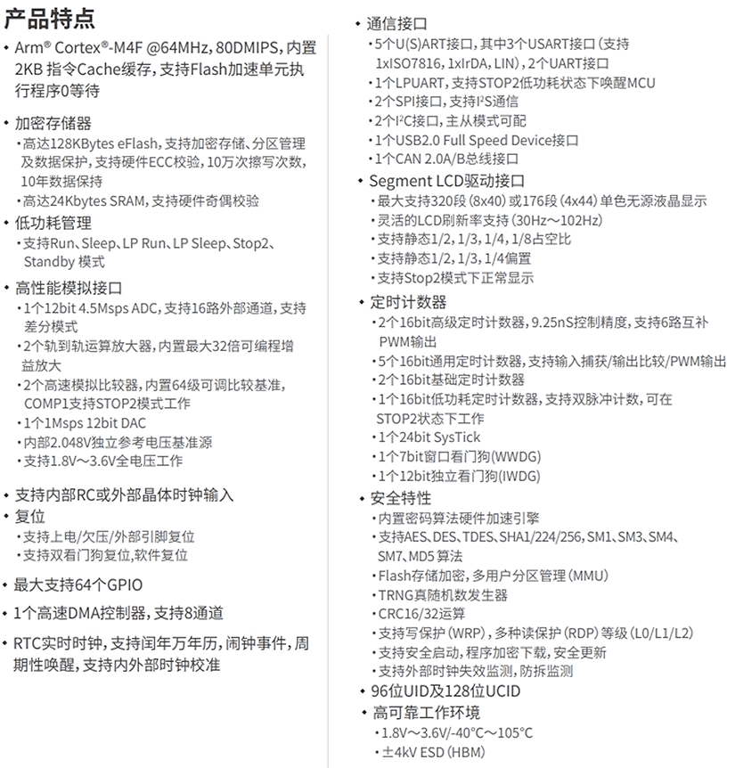 - 行業(yè)領先的低功耗水平,更加低碳環(huán)保。芯片動態(tài)運行功耗低至60μA/MHz,靜態(tài)功耗低至1.5μA。