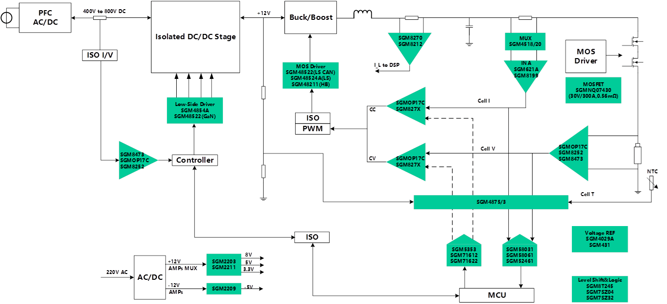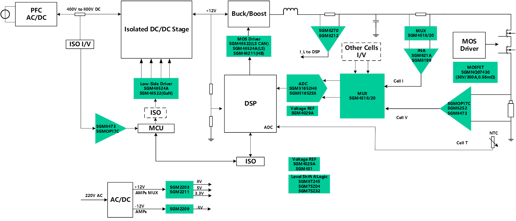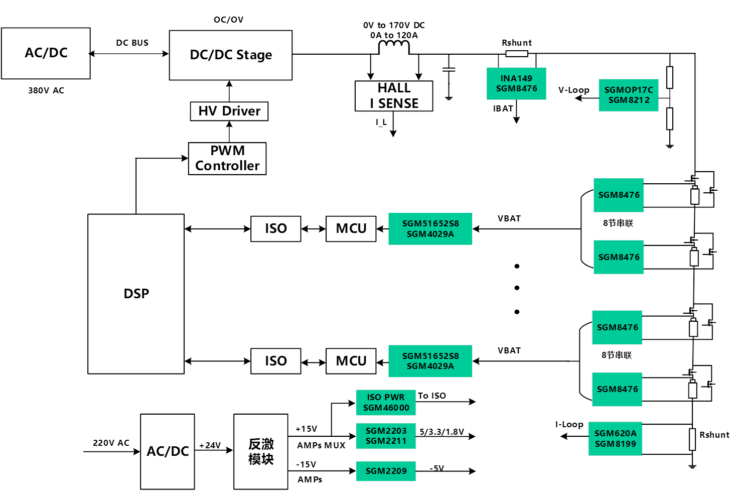 隨著個人便攜設(shè)備和新能源汽車快速發(fā)展,鋰電池市場需求持續(xù)增長,各個電池廠商對化成過程中鋰電池充放電電流/電壓測量的誤差要求也顯著提高,對整個測量控制電路中放大器、ADC/DAC、電壓基準的誤差要求也相應(yīng)提高。同時,在激烈的市場競爭下,方案性價比高也是各個廠家要求之一。圣邦微電子能用更低成本實現(xiàn)更高精度、更高功率的電池化成I/V控制。