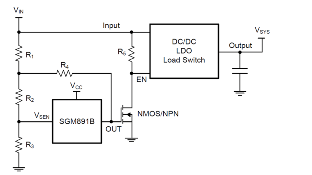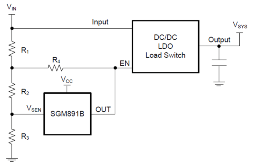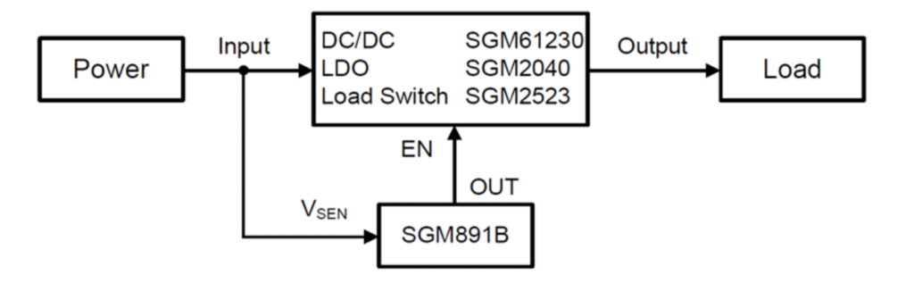 應(yīng)用框圖所示,電源輸出接后級(jí)DC/DC、LDO或負(fù)載開關(guān),同時(shí)采用電壓監(jiān)控器SGM891B監(jiān)控電源的輸出電壓,電壓監(jiān)控器輸出端OUT控制DC/DC(SGM61230等)、LDO(SGM2040等)或負(fù)載開關(guān)(SGM2523等)的使能端EN。在實(shí)際應(yīng)用中: