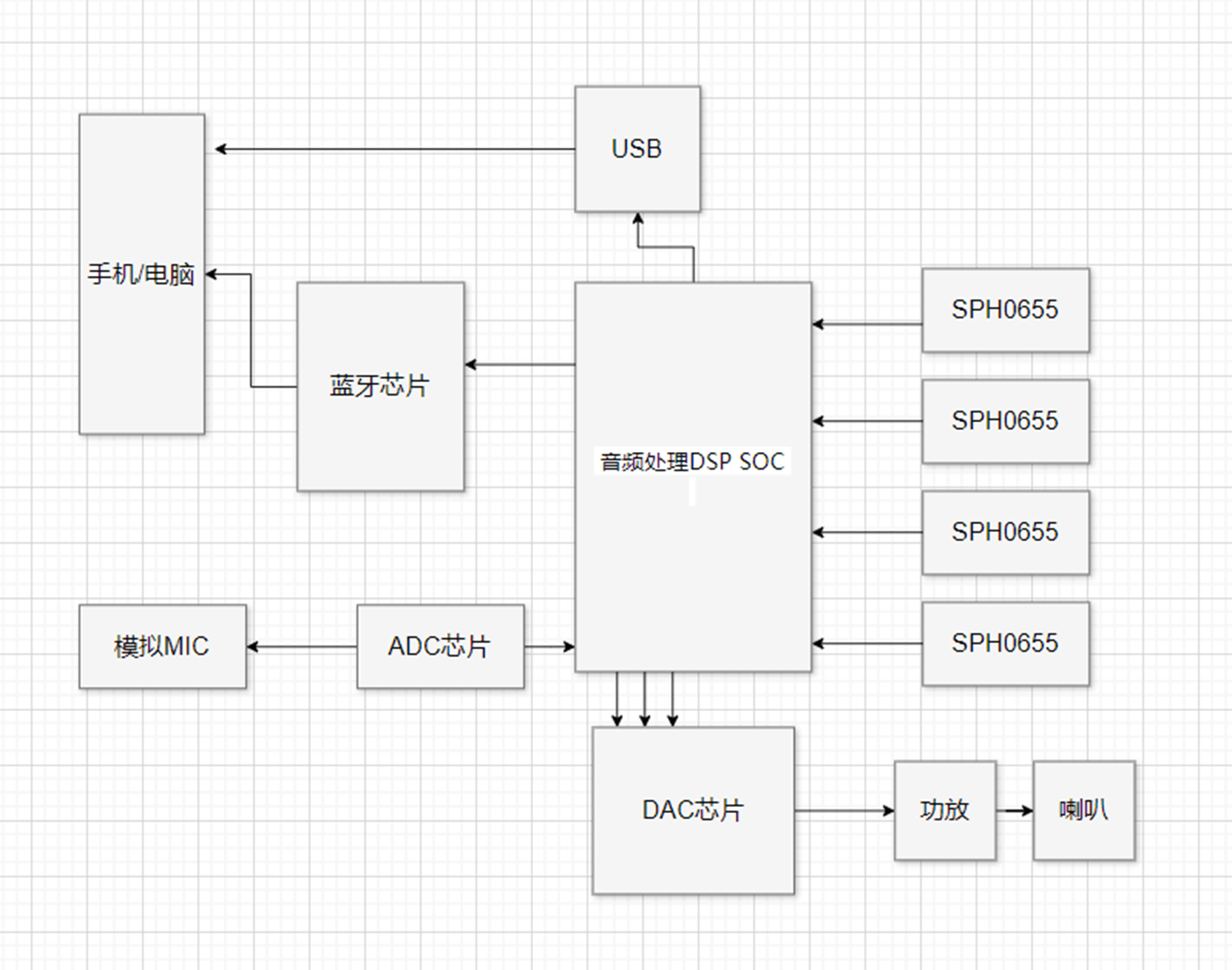 系統(tǒng)主要包括DSP頻處理芯片、ADC芯片、DAC芯片、功率放大器、喇叭、數(shù)字麥克風(fēng)陣列等, 音箱通過麥克風(fēng)陣列拾音后將音頻信號輸出到音頻處理芯片,電腦或手機(jī)給到音頻處理芯片的音頻信號作為AEC(回聲消除)參考源,再通過音頻處理芯片內(nèi)部AEC算法做回音消除,電腦或手機(jī)通過USB接口9或藍(lán)牙與會議音箱連接,將遠(yuǎn)端說話者的聲音直接通過會議音箱的喇叭5播放出來。