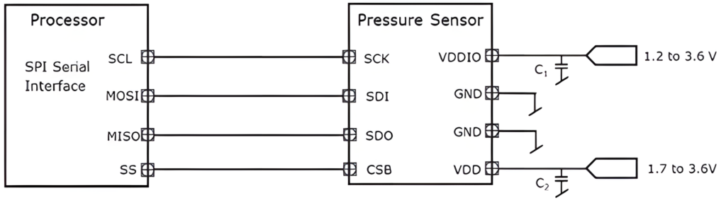 應(yīng)用程序中使用這些系數(shù)將測量結(jié)果轉(zhuǎn)換為高精度壓力和溫度值。FIFO的結(jié)果可以存儲多達(dá)32個測量結(jié)果,從而降低了主機處理器輪詢速率。主機可以通過串行I2C或SPI接口讀取傳感器的測量和校準(zhǔn)系數(shù),傳感器的測量狀態(tài)可以通過SOD管腳上產(chǎn)生的中斷進(jìn)行判斷。