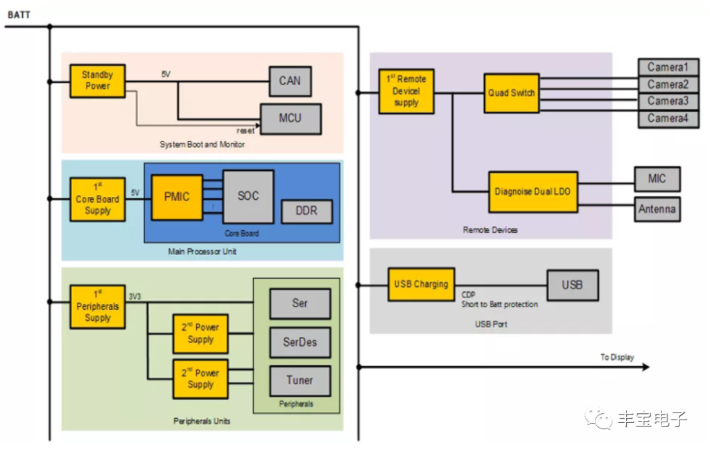 車機(jī)的典型電源架構(gòu)如圖所示。一般而言,系統(tǒng)MCU和CAN模塊通過一級LDO供電,以實現(xiàn)系統(tǒng)監(jiān)測和喚醒。兩個DC/DC變換器用于給主處理器核心板和其他外設(shè)模塊供電,諸如串行器、解串器和tuner IC等。攝像頭模組由獨立的供電單元供電。另外,還有專門的USB充電器IC為車機(jī)前面板的USB端口提供電力。