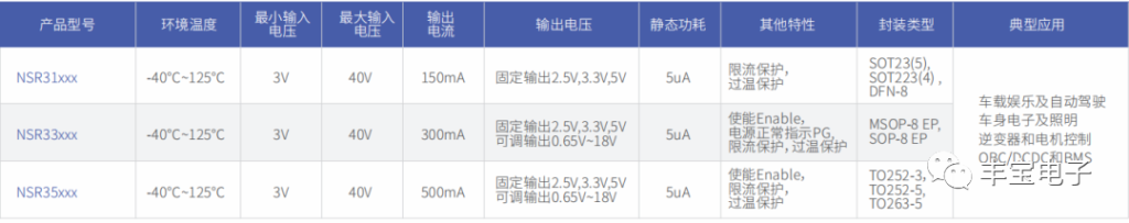 NSR31/33/35系列提供給硬件設(shè)計者充足的解決方案,有各種固定電壓版本:2.5V、3.3V和5.0V,也提供輸出可調(diào)選項(0.65V至18V)。此外,不同系列分別提供150mA,300mA,500mA的輸出電流能力,可由芯片內(nèi)部限制。此低功耗線性調(diào)節(jié)器還內(nèi)部集成了短路保護(hù)、過溫保護(hù)功能。 這些器件可在-40℃至125℃的環(huán)境溫度下運行,提供多種封裝SOT223,SOT23DFN-8, MSOP-8 EP, SOP-8EP,TO252, TO263等,滿足不同設(shè)計需求。